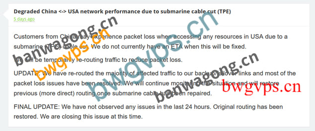 这次并不是这个问题,主要原因在于CN2线路的海底光缆出现故障,正在抢修中。预计今天会解决,目前看来也在陆续恢复。其实,我们应该有注意到,搬瓦工VPS商家的CN2 GIA方案都取消购买,不过也在陆续恢复。