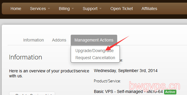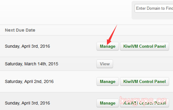根据上图,我们可以到当前所有的VPS列表中,选择需要升级的方案,点击对应后面的Manage按钮进入管理。